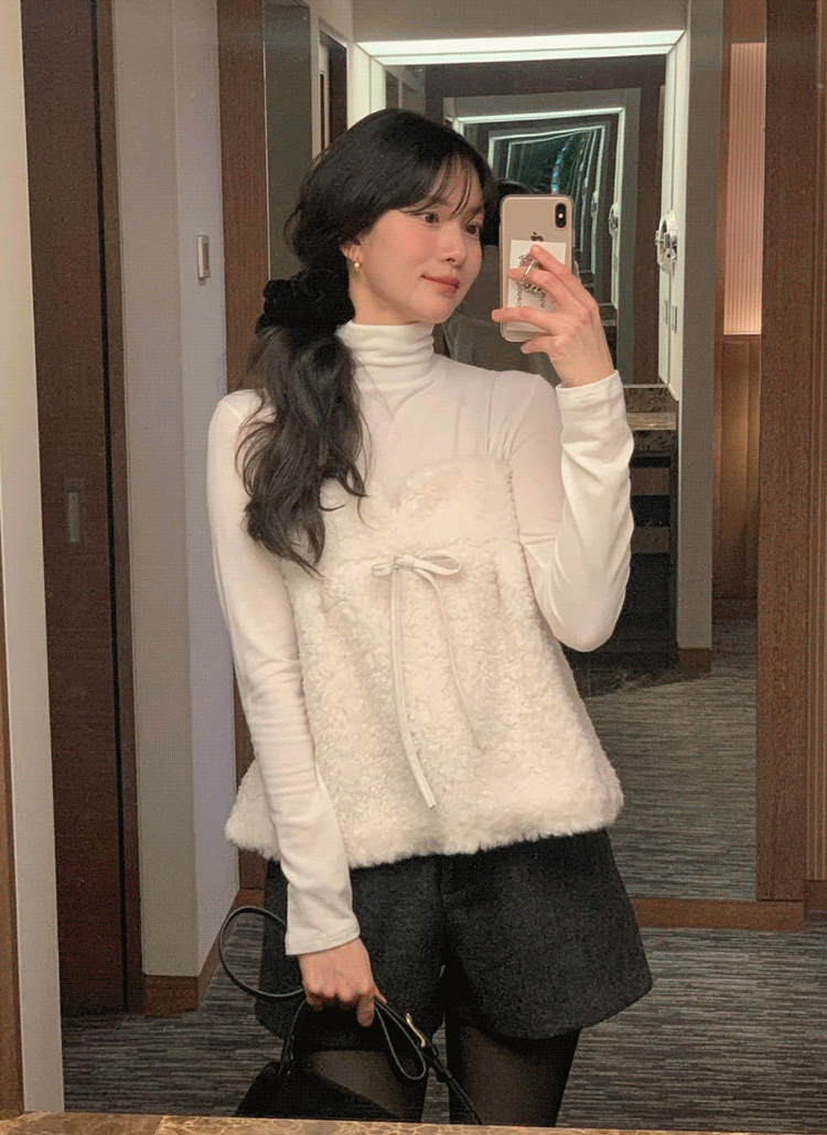 ウール混タートルネックケーブルニットベストストラップ付