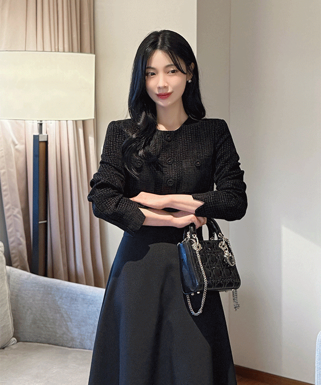 ツイードコンビジップアップラウンドネック長袖ミディフレアワンピース