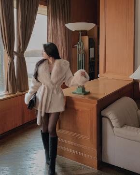ラクーン混紡ダックダウンシャギー長袖ルーズドローストリングポケットジップアップフードダウンジャケットファーセット