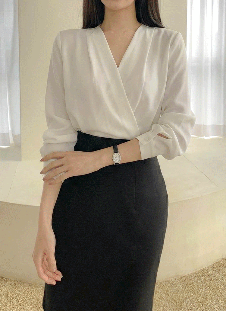 裏起毛ストレッチVネックスリムレイヤード風長袖ギャザーTシャツ