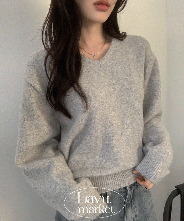 メランジウール混Vネックラグランリブハーフルーズ長袖ニット
