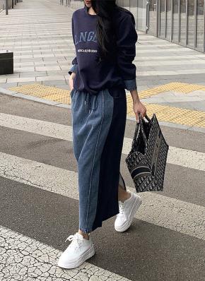 デニムコンビ配色ウエストゴムスリットラウンドネックセットアップスカートスウェット
