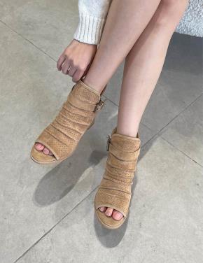 シャーリングオープントゥバックルカラーヒールサンダル