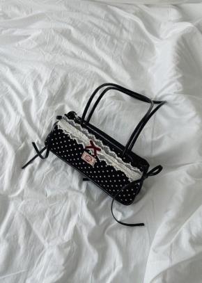 コットンシャーリングダイアゴナルフリルリボンポケットドットエコバッグ
