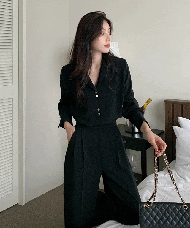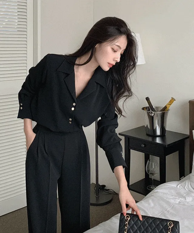 ゴールドボタンオープンカラーブラウス