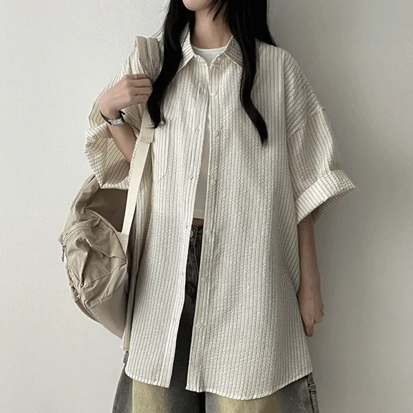 エンボスボクシーカラーボタンストライプシャツ