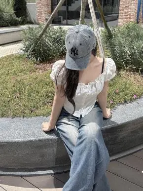 ボタンオフショルダーフリルゴムパフスリーブクロップド半袖ブラウス