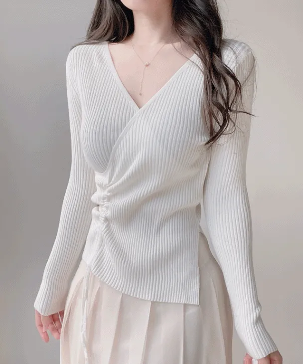 リブVネックドローストリングカシュクールニット
