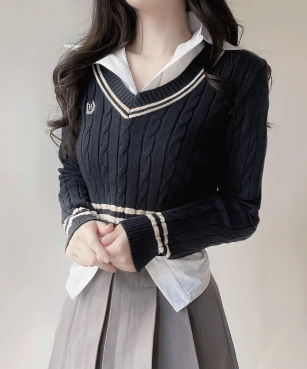 Vネッククロップドケーブル配色ニット