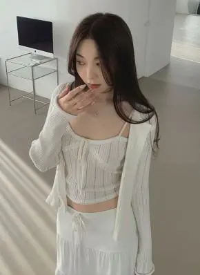 リブレースコンビリボンボタンストラップUネックドローストリングクロップドスリム長袖カーディガンノースリーブアンサンブル