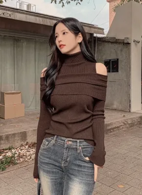 タートルネックオープンショルダーリブニット