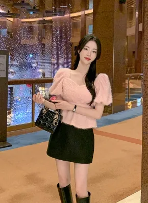 スクエアネッククロップド半袖ニット