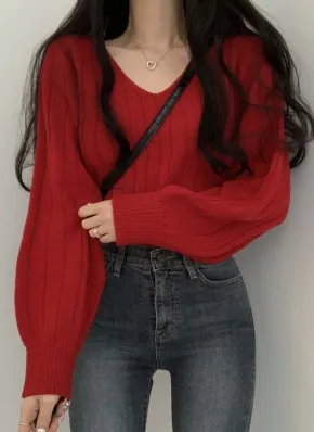 Vネックリブニット
