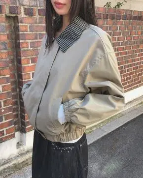スエード調ノーカラースナップボタンゴムジャンパー