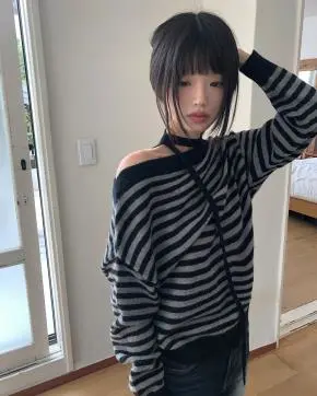 ストラップ付オフショルダー長袖ボーダーニット