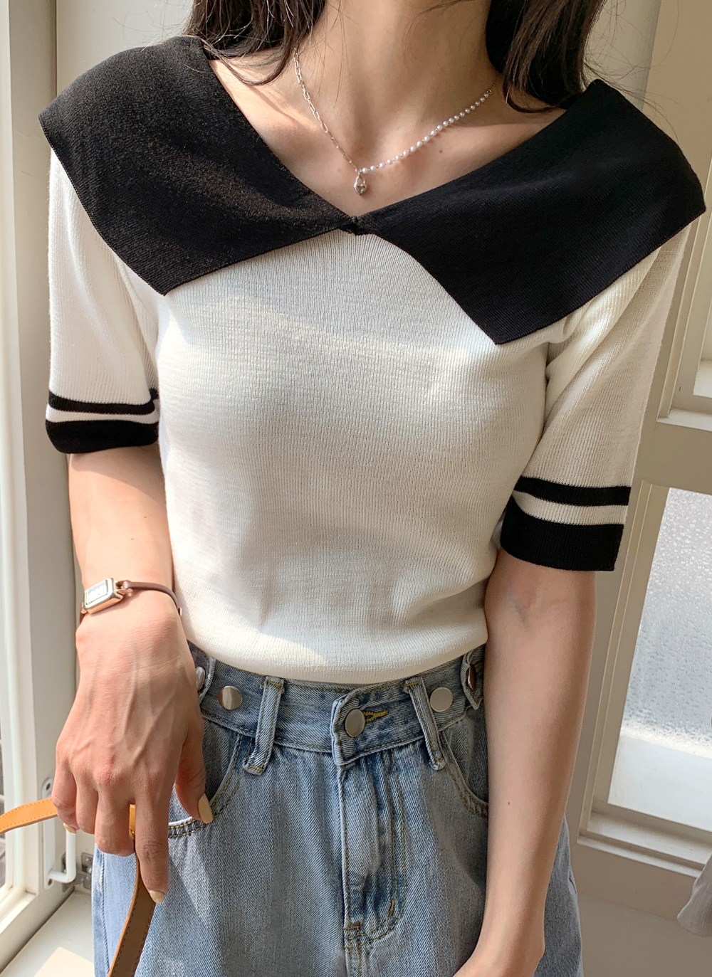 襟と袖口の配色が映えるニットです。