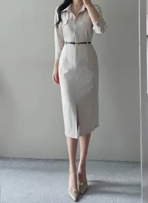 ベルト付スリットフェイクポケットバックゴムシャツワンピース