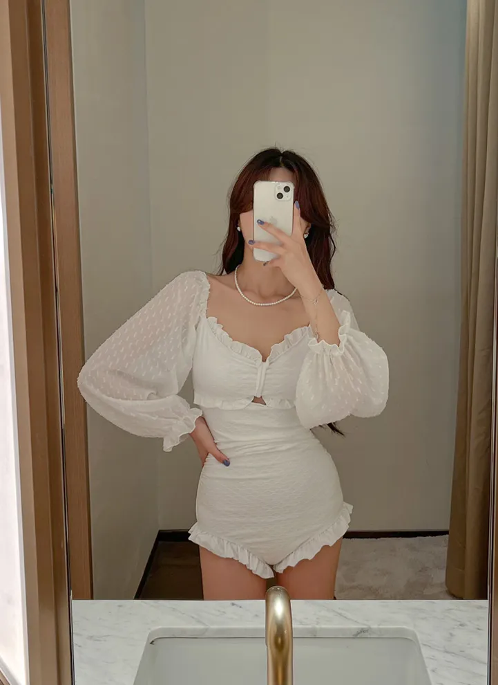 フリルシャーリング配色ワンピース水着