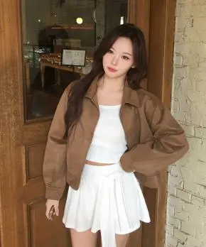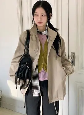 コットンジップアップハイネックドローストリングスリットピンタックゴムオーバーサイズロングルーズフラップポケットスナップボタンハーフドロップショルダー無地ジャンパー[選べる丈]