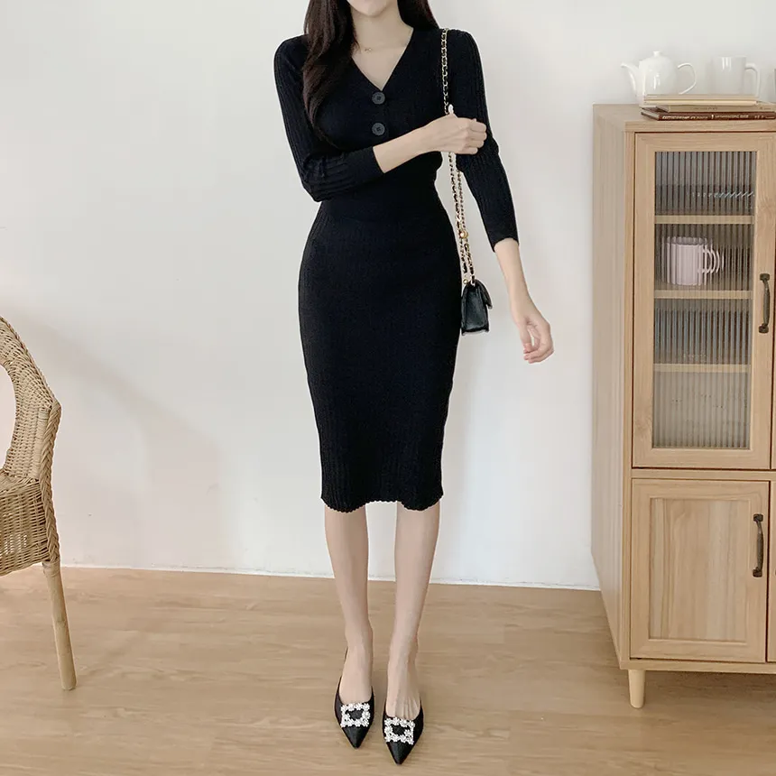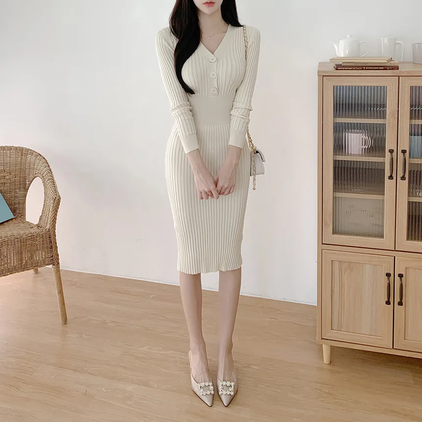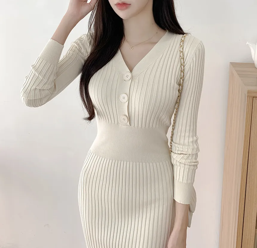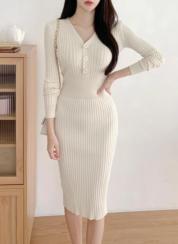 Vネックスリムリブニットワンピース