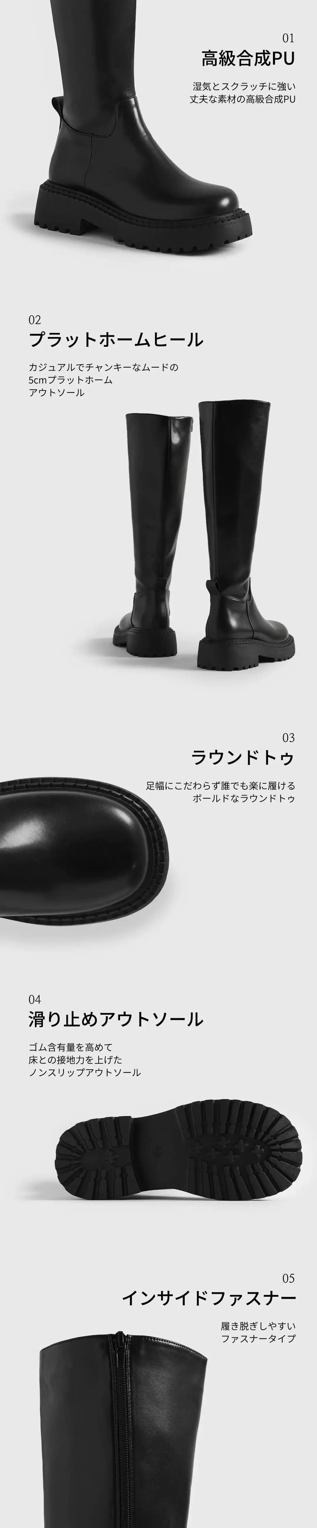 足幅 : 10 総丈 : 27 ヒール(前/後) : 2.5/5 全体の高さ(ヒール含む) : 44.5 入り口断面 : 18.5 足首断面 : 11 ふくらはぎ断面 : 15.5
