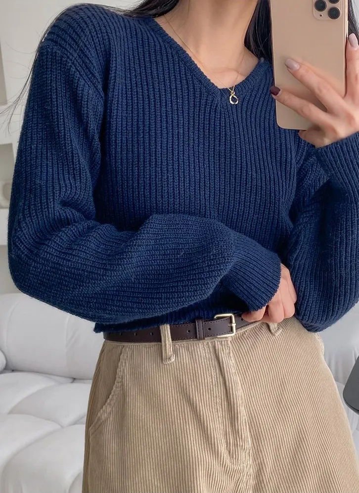 リブボタンラウンドネックカラーニット