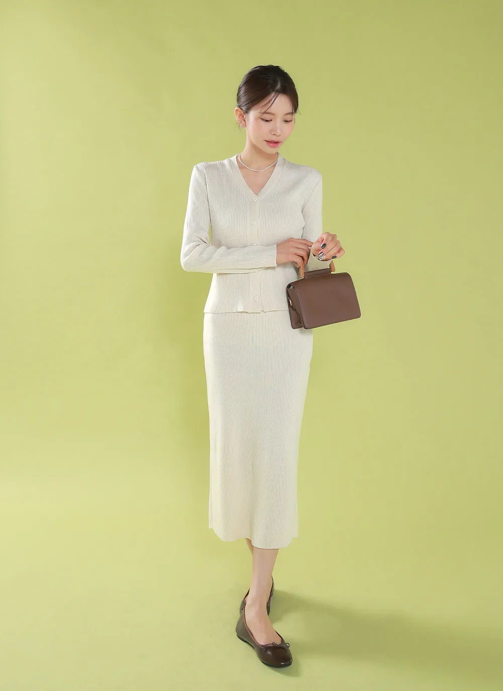 スリムな縦のラインで洗練されたリブニットセットアップ。