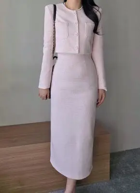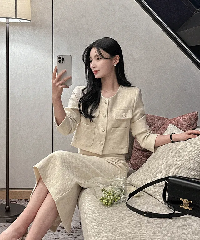 ツイードボタンラウンドネックノーカラーポケット肩パッドクロップド長袖フェイクポケットHライン(ロング丈)ヒドゥンジッパー無地ツーピース(トップス、ボトムス)スカートジャケット