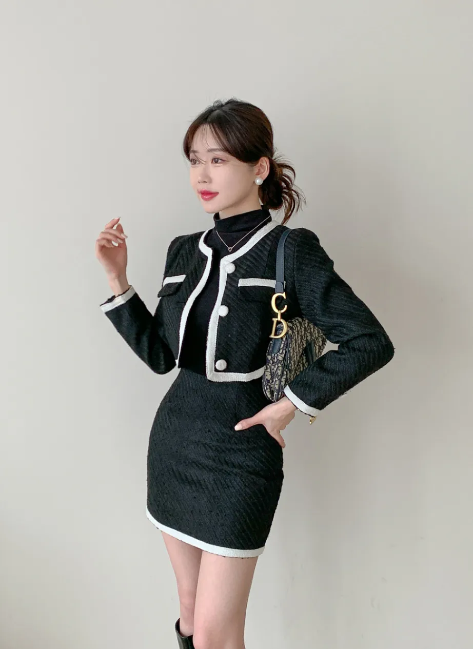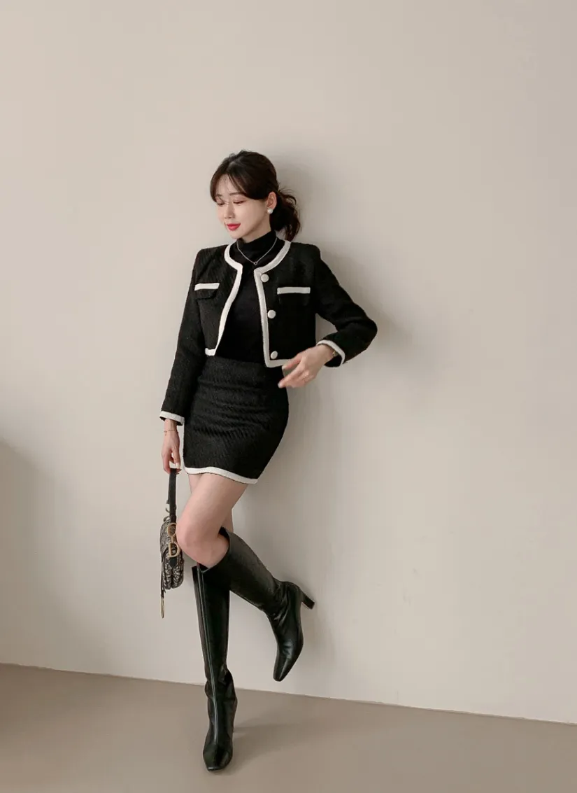 キルティングウール混エコファージップアップスクエアネックスリット肩パッドラインクロップドフラップポケットタックビジューボタンHライン(ロング丈)チェックツーピース(トップス、ボトムス)スカートジャケッ