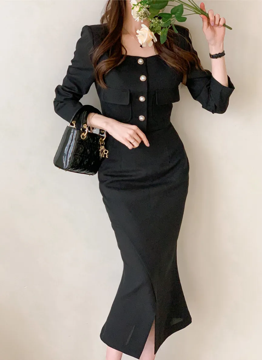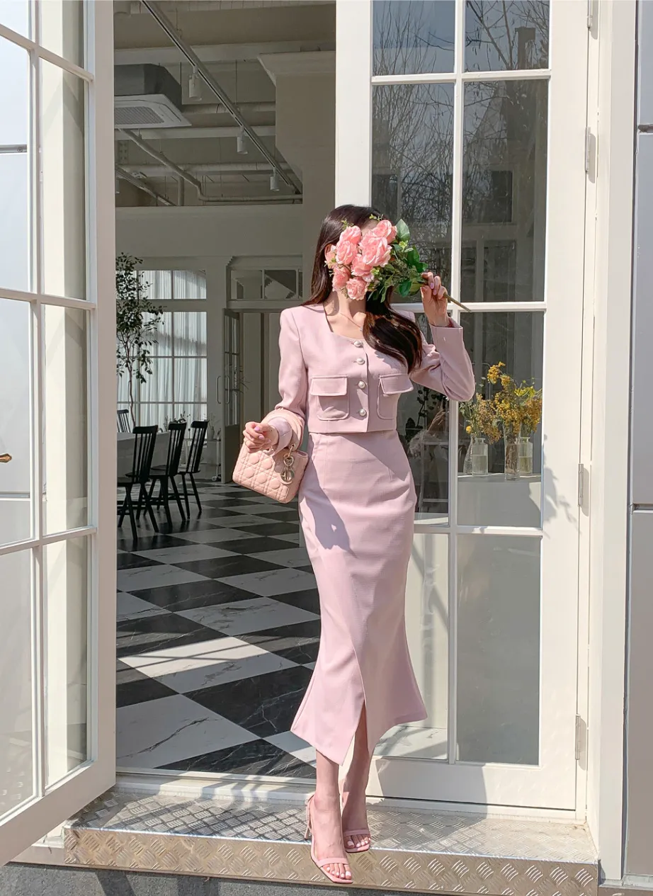 カラークロップドロングAラインフレアボタンスリーブジップアップパフスリーブ肩パッドスナップボタンパール調ボタン無地ツーピース(トップス、ボトムス)スカートジャケットジャケット