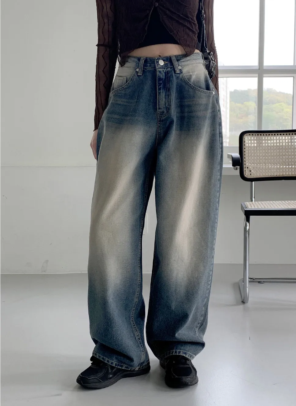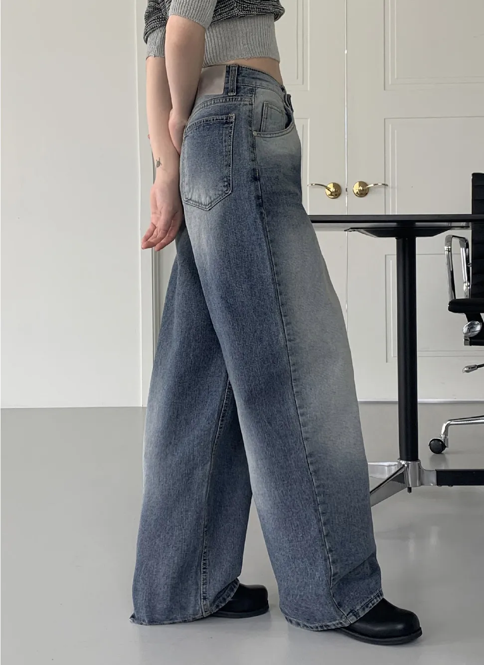 デニムベーシックショートループリベットジップアップリボン(固定)ワイドバックポケットポケットフラップポケットウォッシングディープブルーデニムパンツ[選べる丈]
