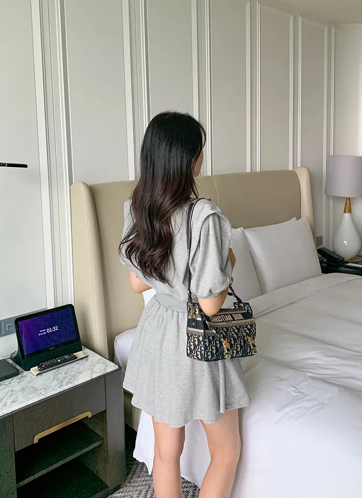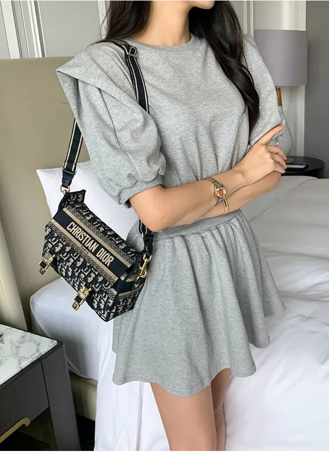 エンボスラウンドネックピンタックバックゴムパフスリーブオーバーサイズ半袖フレアAラインセミクロップド後ボタンヒドゥンジッパー無地ツーピース(トップス、ボトムス)ブラウスショートパンツ