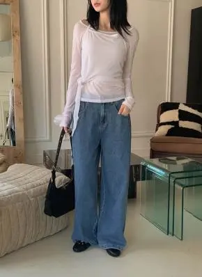 デニムコットンウォッシングポケットリベットバックポケットストレートワイドジップアップバックルループヒドゥンバンディングライトブルーディープブルーデニムパンツ[選べる丈]