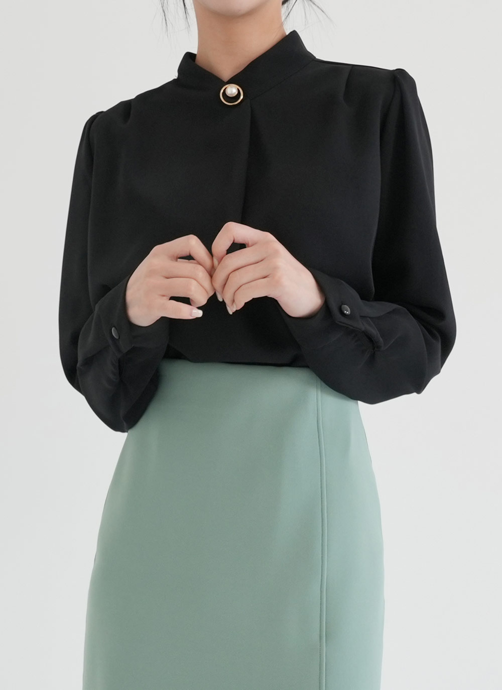 ハイネックパフスリーブピンタックパール調ボタンブラウス
