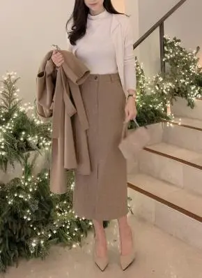 ウール混スリットウエストゴムHライン(ロング丈)スカート