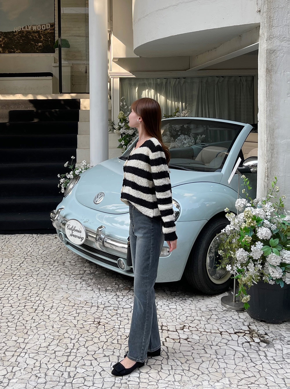 絶妙なピッチのボーダーカーディガンはゴールドボタンで