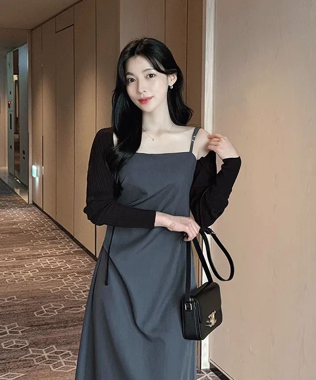 スリムストラップ長袖ラウンドネッククロップドロングアンバランスフリルドレープシャーリングバックゴム無地チューブトップカーディガンアンサンブル