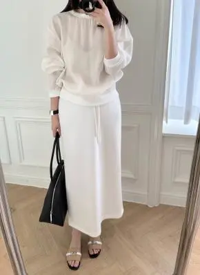 ツイードラウンドネックノーカラーリンクル肩パッドウエストゴムロング長袖ビジューボタンフレアコサージュAラインツーピース(トップス、ボトムス)スカートジャケット