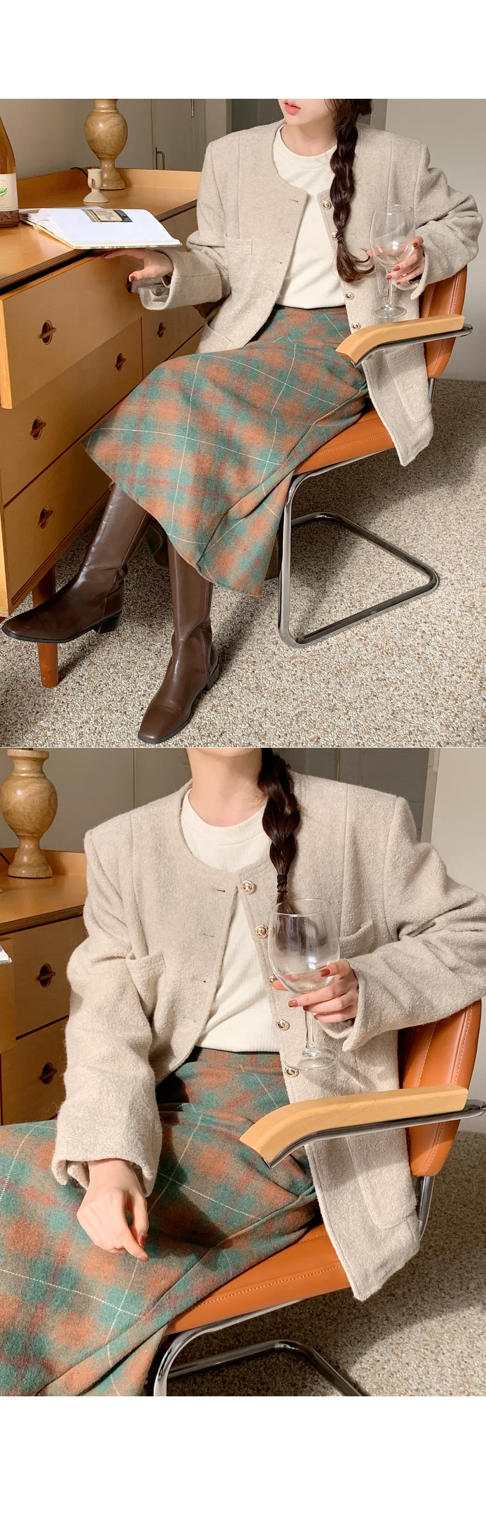 ウール混ラウンドネックツイードジャケット