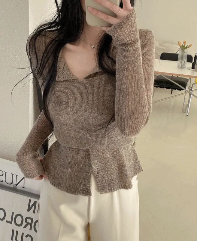ニットウール混ボタンラウンドネック長袖ベーシックアンサンブルカーディガンビスチェ