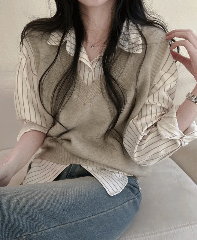 ニットボタンカラールーズ長袖レイヤードストライプシャツベストアンサンブル