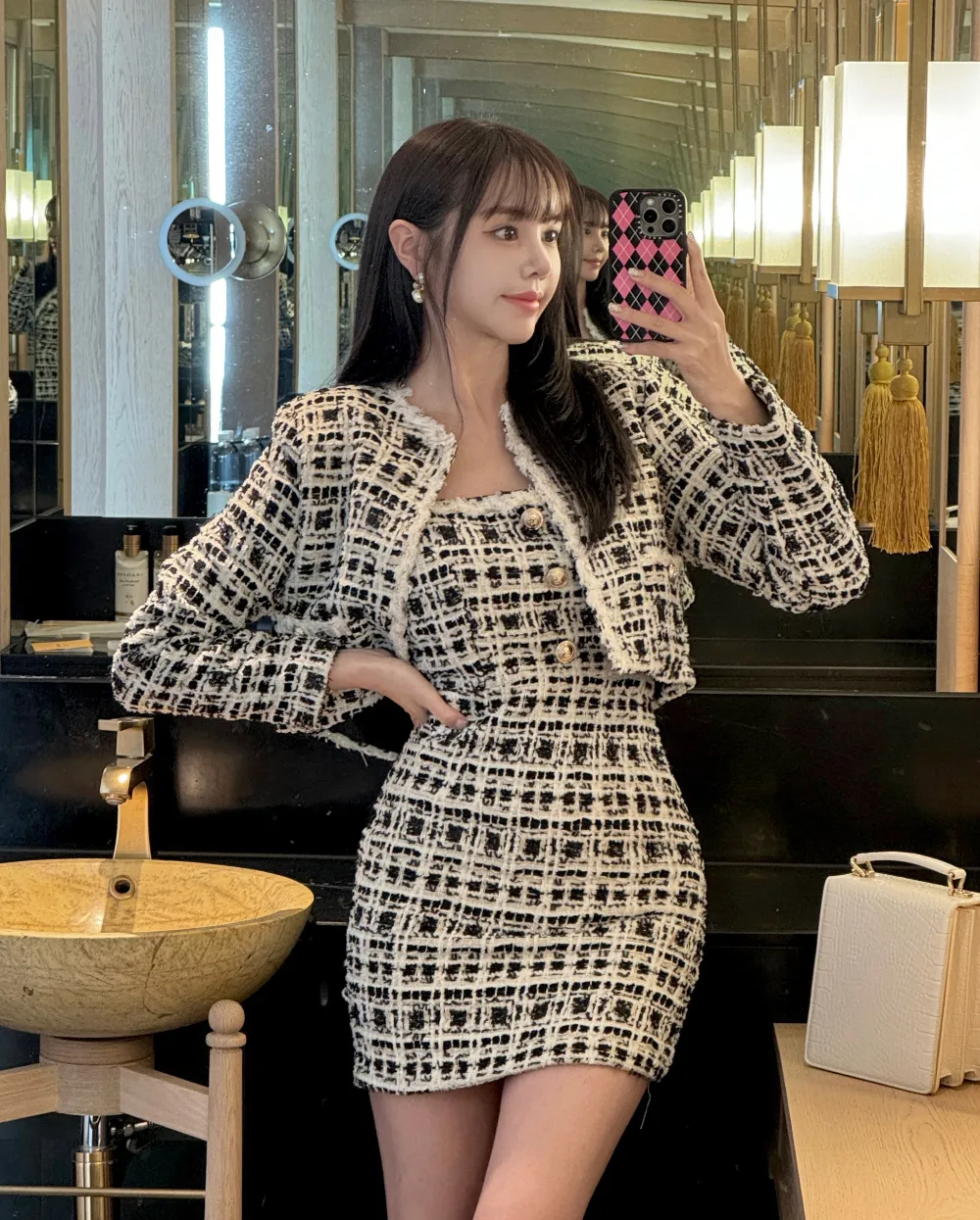 ツイードノーカラー肩パッドパフスリーブショートロング長袖フレアAラインダブルボタンヒドゥンジッパーツーピース(トップス、ボトムス)スカートダブルジャケット
