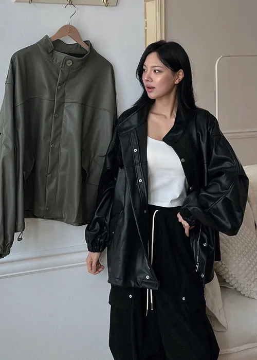 レザー調ツーポケットフラップポケットヒドゥンジッパードローコードオーバーサイズハーフ長袖ピンタックラインハーフネックスナップボタンジャンパー