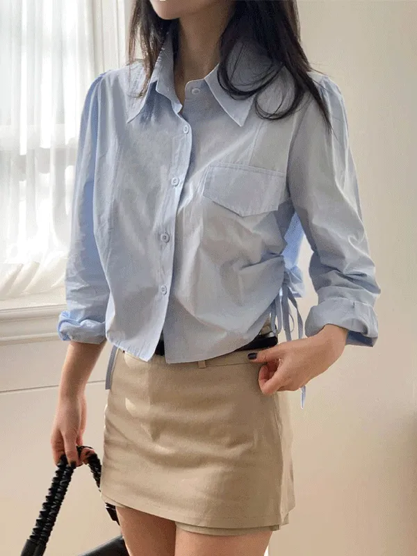 コットンボタンカラードローストリング長袖セミクロップドシャツ