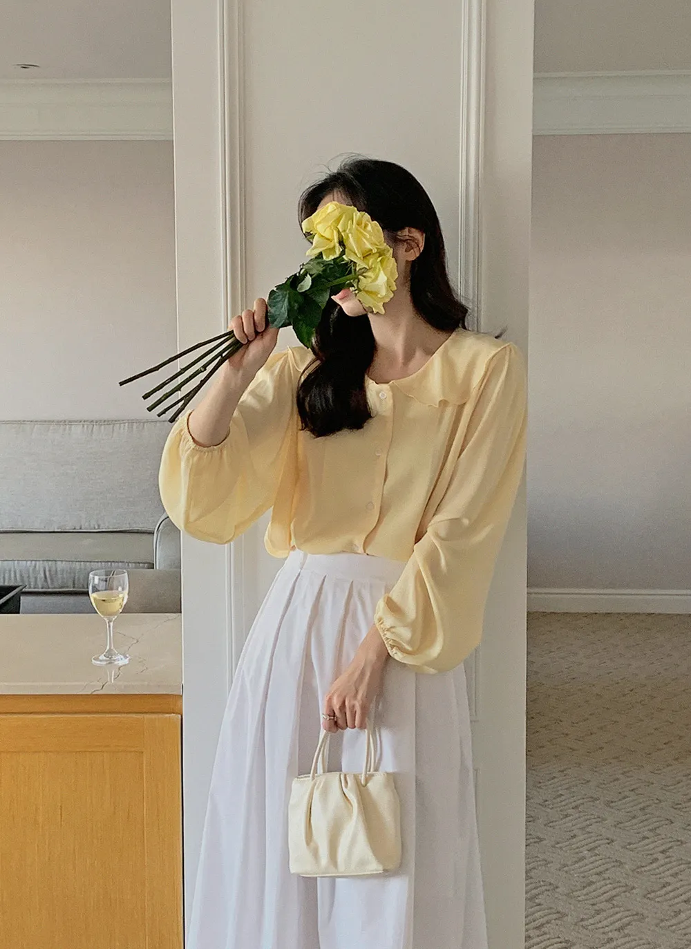 ふんわり揺れるフリル付きの襟元が、