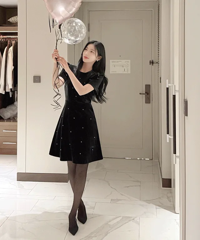 ベルベットジップアップ半袖スタッズワンピース