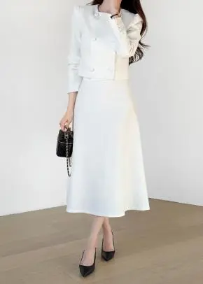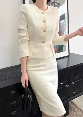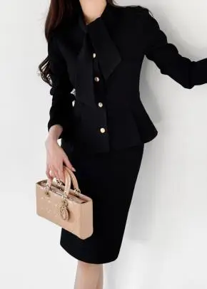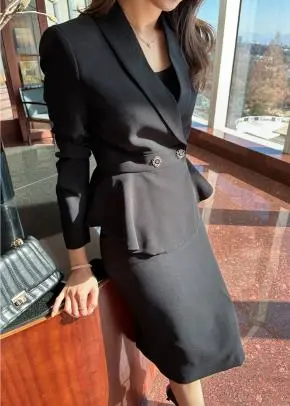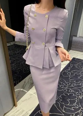 ラウンドネックノーカラースリットハイウエスト肩パッドペプラムスリムHライン長袖タックシークレットボタンダブルボタン無地ツーピース(トップス、ボトムス)スカートダブルジャケット