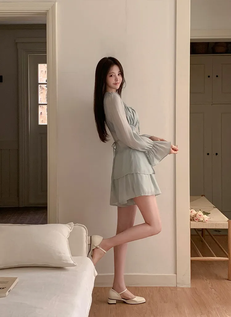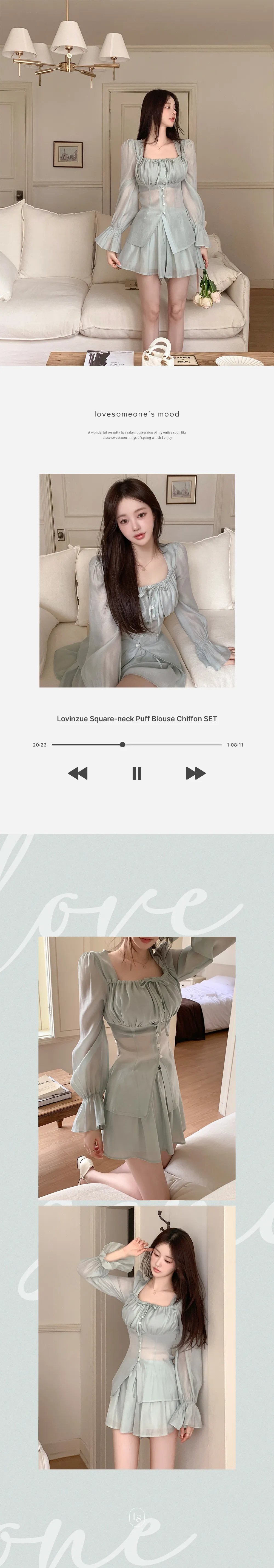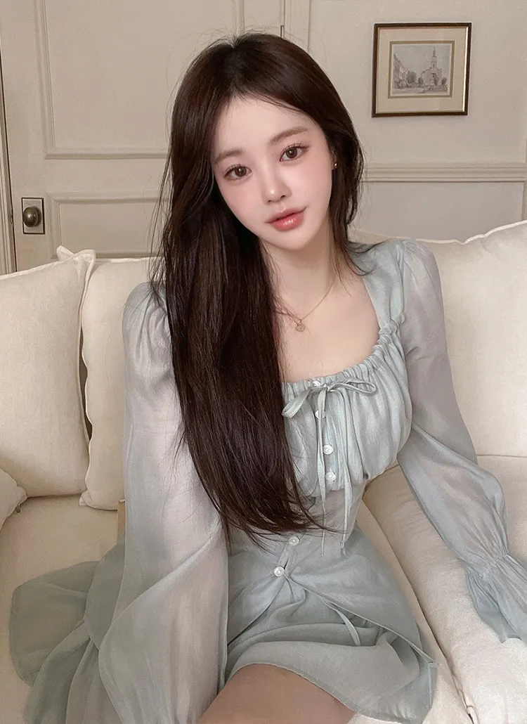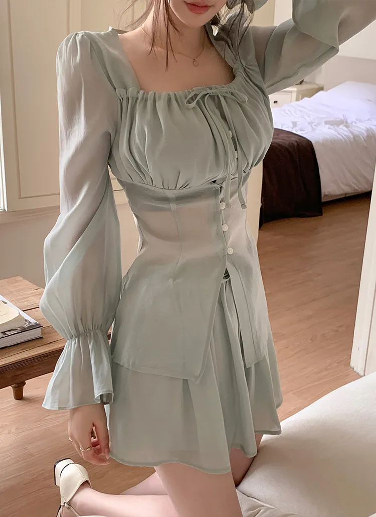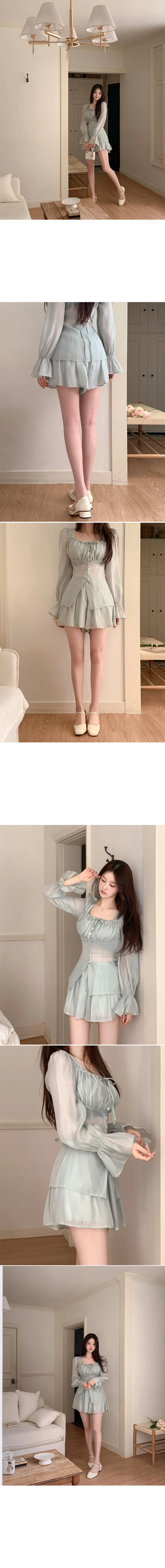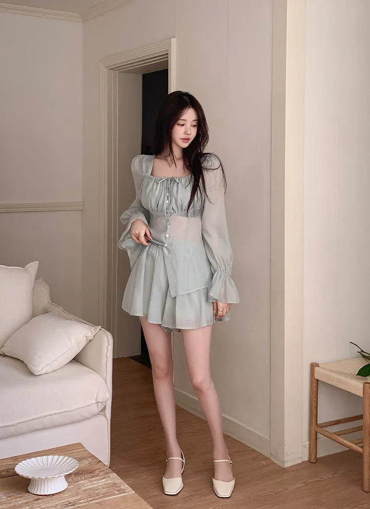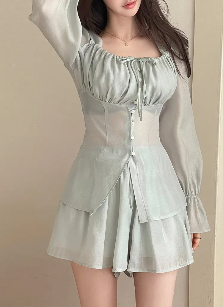 シースルーボタンスクエアネックラインウエストゴムパフスリーブスリムショート長袖ギャザーフレアAライン無地ツーピース(トップス、ボトムス)ブラウスショートパンツ
