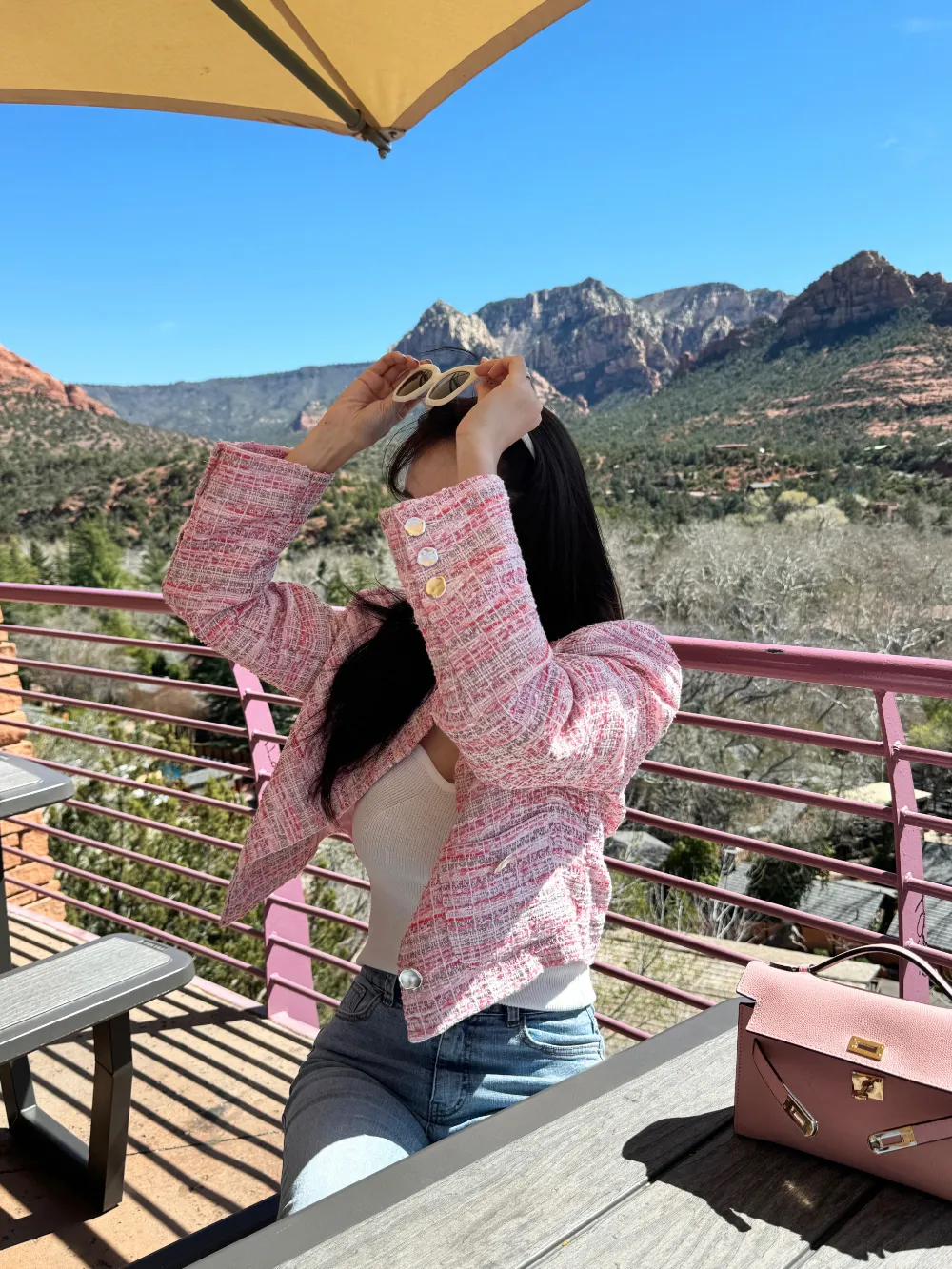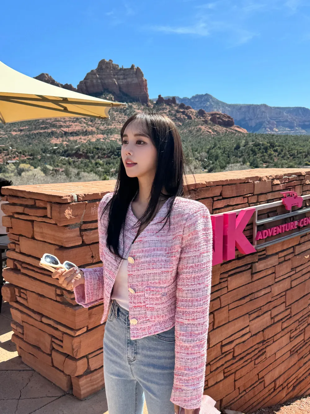全体的に明るく爽やかな雰囲気が漂うピンク色のツイードジャケット。