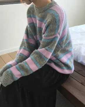 ウール混ラウンドネックオーバーサイズ長袖ハーフボーダー配色ニット